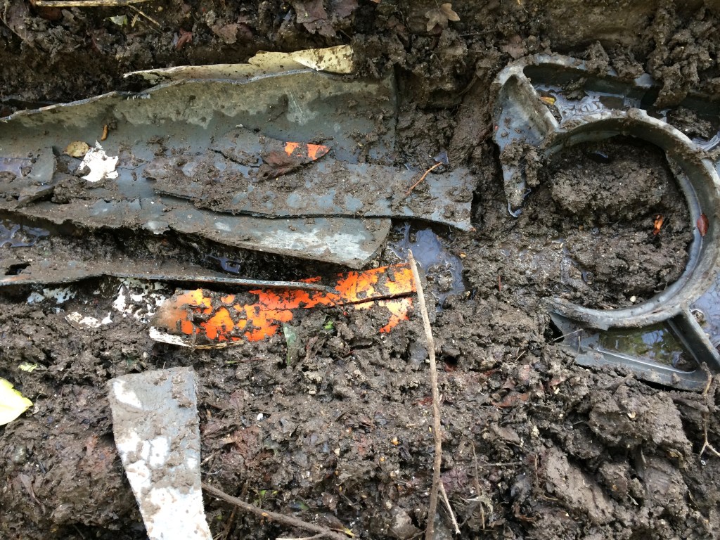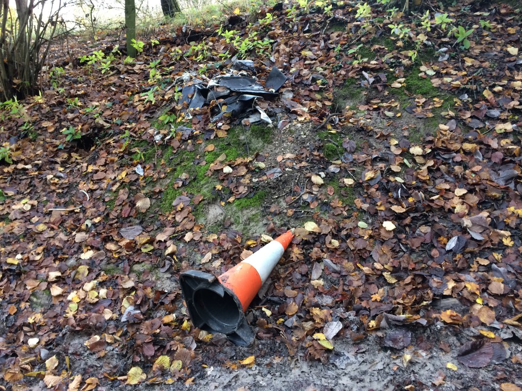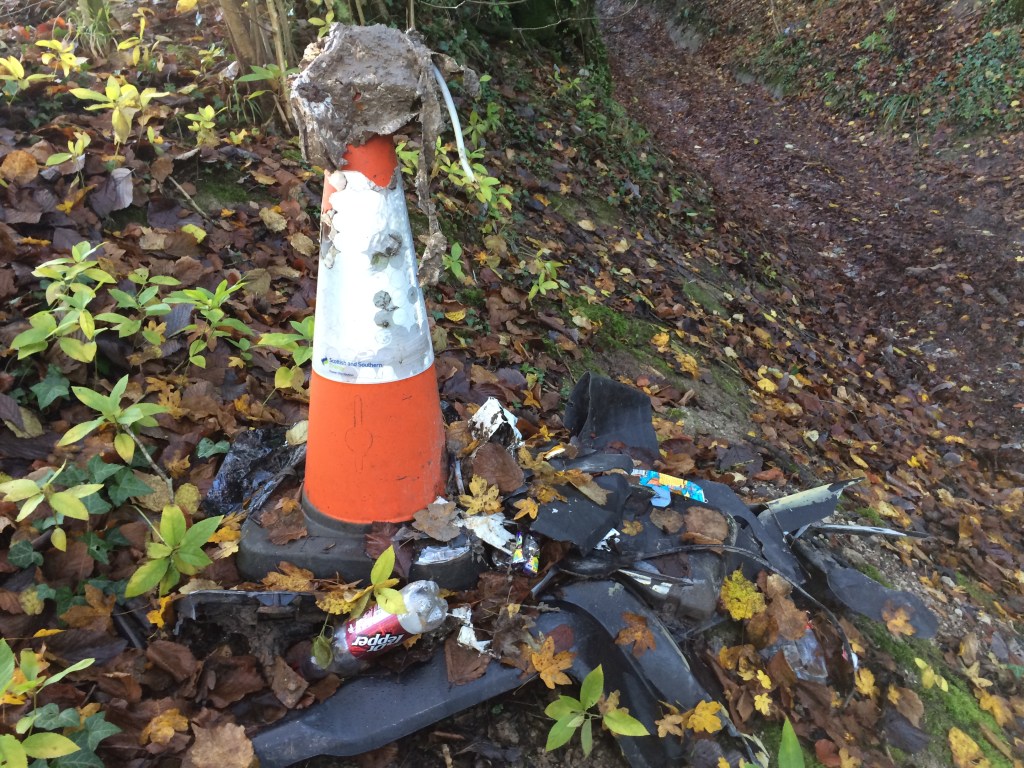 Human intervention, beyond my own, has reconfigured the original pile, Rubbish Cairn No 1. The images below show how the traffic cone has travelled off the pile during the month to end up crushed into the muddy rut lower down the hill.