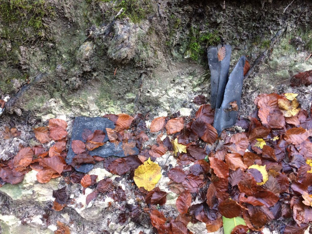 Throughout the Autumn I have continued adding to the collections of plastic waste as I walk on Byway 745 – the Rubbish Cairns I started building in August 2019. Torrential rain has scoured the chalk ruts which are repeatedly attacked by off-road vehicles. Churned up mud and fallen leaves then re-cover the chalk. Detritus is buried in the mud and revealed later with the next scouring.