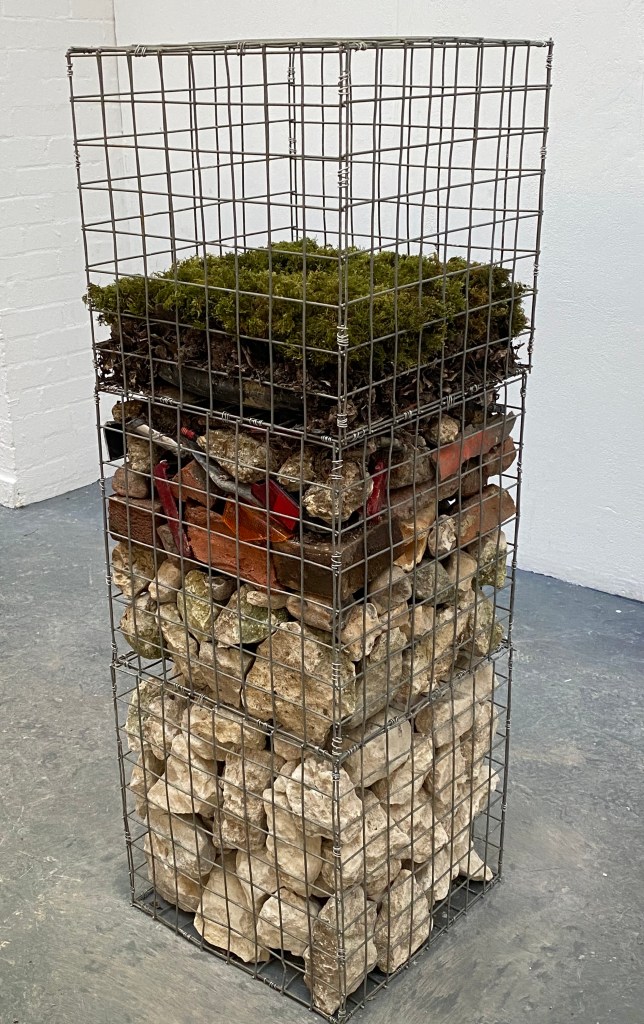 This work consists of a stack of hand built gabion baskets filled with collected materials from the landscape. The largest layer is chalk, then flint, brick, concrete, plastic and metal objects, earth and moss.