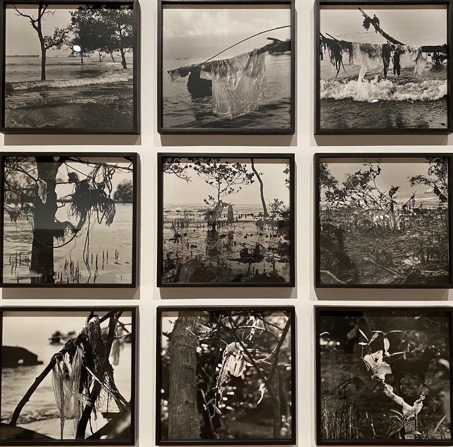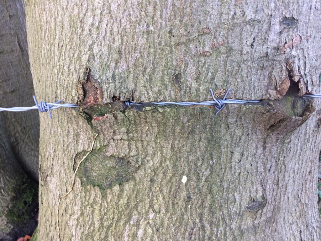 The human impact on trees is explored by artists who draw attention to their role in bearing witness to the atrocities of human activity. Steve McQueen’s location shot for the film 12 Years a Slave actually turns out to contain a tree that had been used in lynchings. The tree is an accomplice and a witness. Simryn Gill makes a record of the plastic detritus that washes into the mangrove trees along the Straits of Malacca in a series of black and white square photographs and Zoe Leonard records trees in New York City that have grown around the wire enclosures that humans have forced them to grow within, leaving them scarred and deformed. In rural boundary-marking trees are also often defaced and injured as my own photographs of trees defaced by being used as posts for barbed wire fencing illustrate.