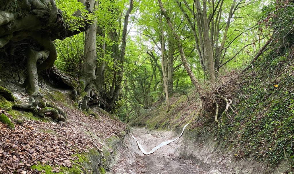 The woodland through which Byway 745 climbs is what’s known locally as a “Hanger” of beech and yew. The track is bounded to the East by a former laid beech hedge now grown out over several hundred years. This line of gnarled trees with exposed roots and horizontal growth marks the boundary of the ancient public right of way and private land. The chalk beneath the shallow roots has eroded away in places, making caves and hollows as the trees form great protuberances over the track as seen in the photograph above. I have started making a series of drawings of this line of beeches including the example below.