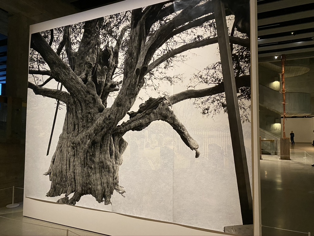 Here I’ll pick out a selection of works from the show that particularly resonate for me. First of all, there is the theme of time running through a lot of the work. Trees are long-lived and often outlive humans by hundreds or thousands of years as seen in Tacita Dean’s painted photograph of one of the oldest yew trees in Britain, Crowhurst 11 2007 which confronts you in the gloom of first room of the exhibition.