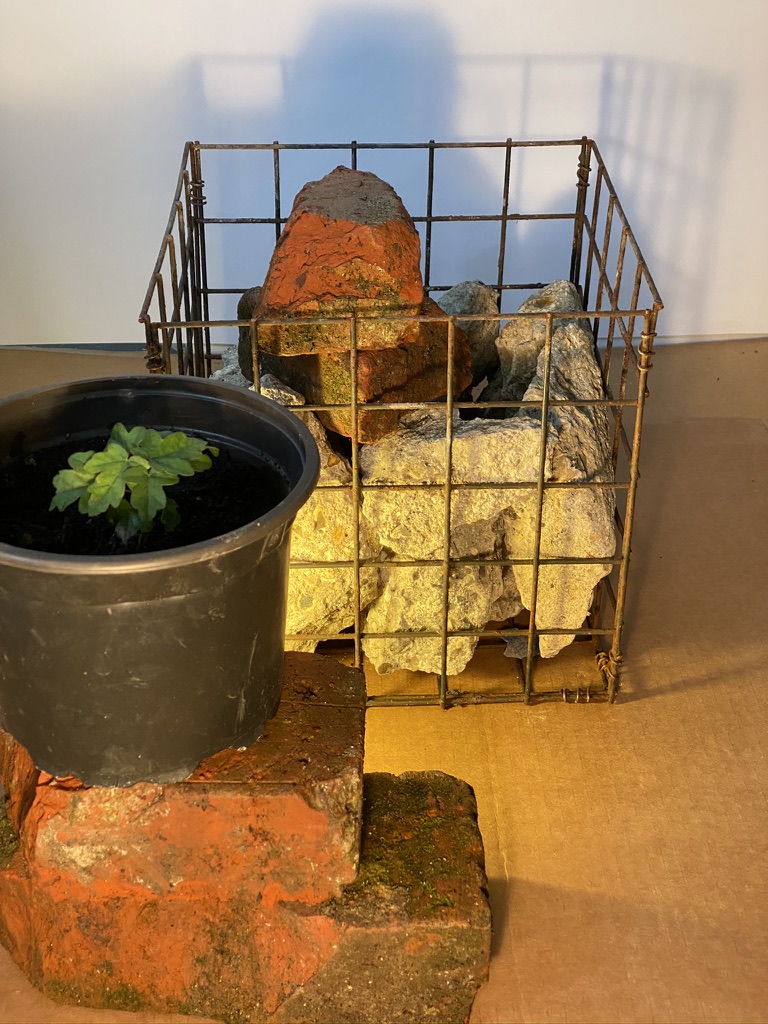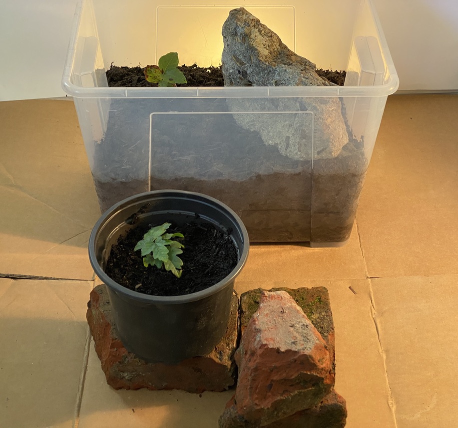 The tree seedlings nurtured since the spring, my Covid-trees, rescued during lockdown are making appearances within my current work. For that work to be viable indoors, I need to experiment with grow lights as I do for the pieces that include terraria and moss.