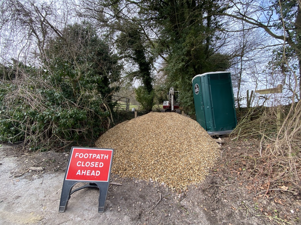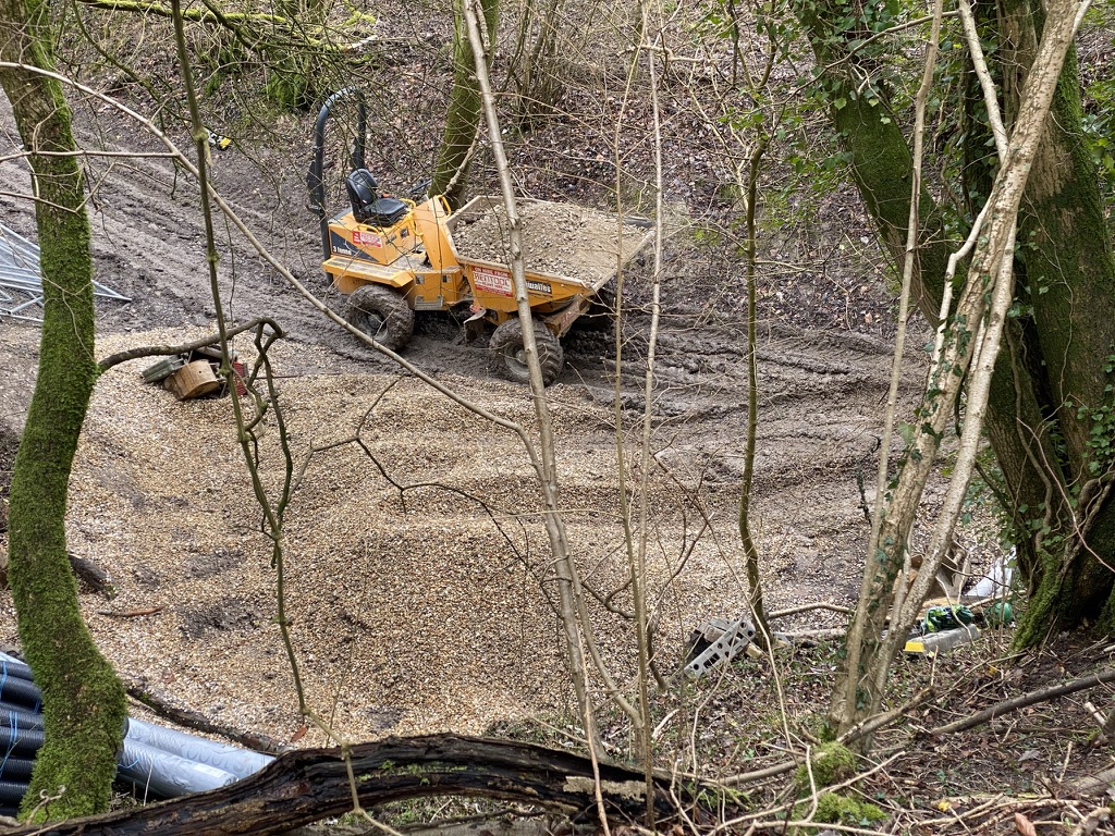 Once the drainage is in place and packed with pea shingle, hardcore of crushed concrete, brick and tarmac is laid on top to be followed by a layer of limestone. This stone is more durable than chalk and binds together to make a firm surface which should weather down to not look too out of place.