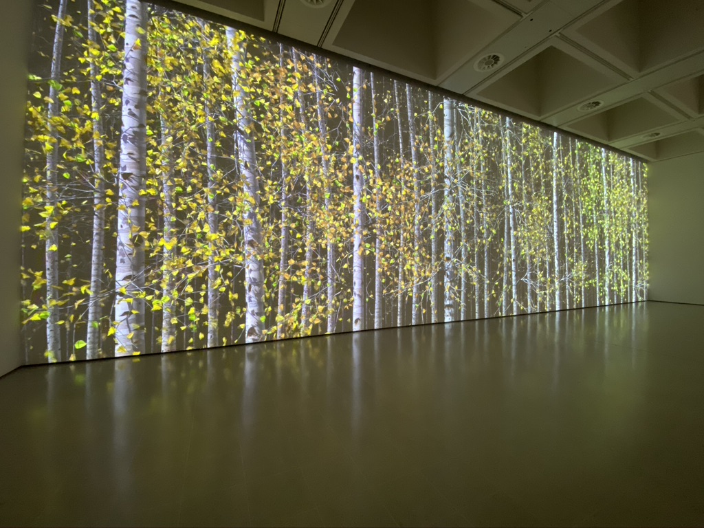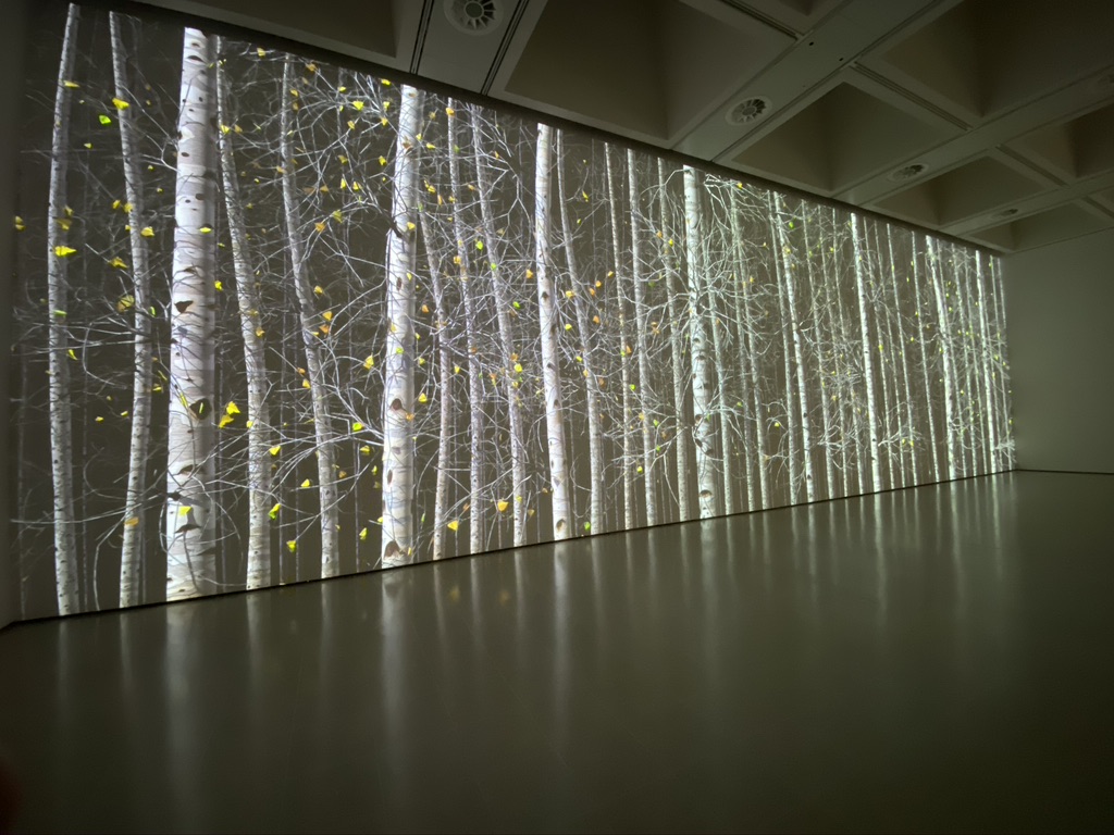 Her piece is a 3 minute computer generated video projection of the seasonal phases of a fictional a birch grove. The viewpoint is looking straight into the trunks, not taking in the tops or the roots of the trees. There is no sense of what is beyond and any movement comes from a gentle swaying of the trunks and a suggested breeze that ruffles the leaves.