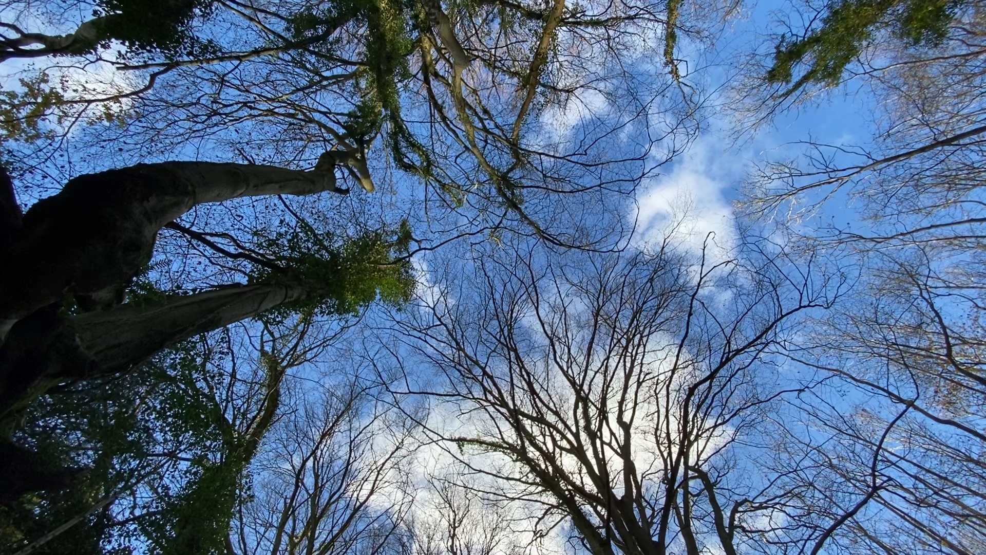 The business of looking up is linked to that of looking down. It is about taking in the whole space. The body of work I have been making in this place is about the critical zone of the lower atmosphere down to the bedrock of chalk. The life of that canopy hovers and glides over me as I aim the camera at it and at the same time as working on this piece I am completing a large scale drawing of the roots of these same trees.