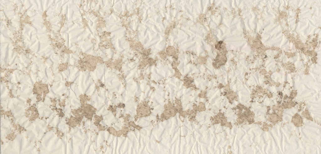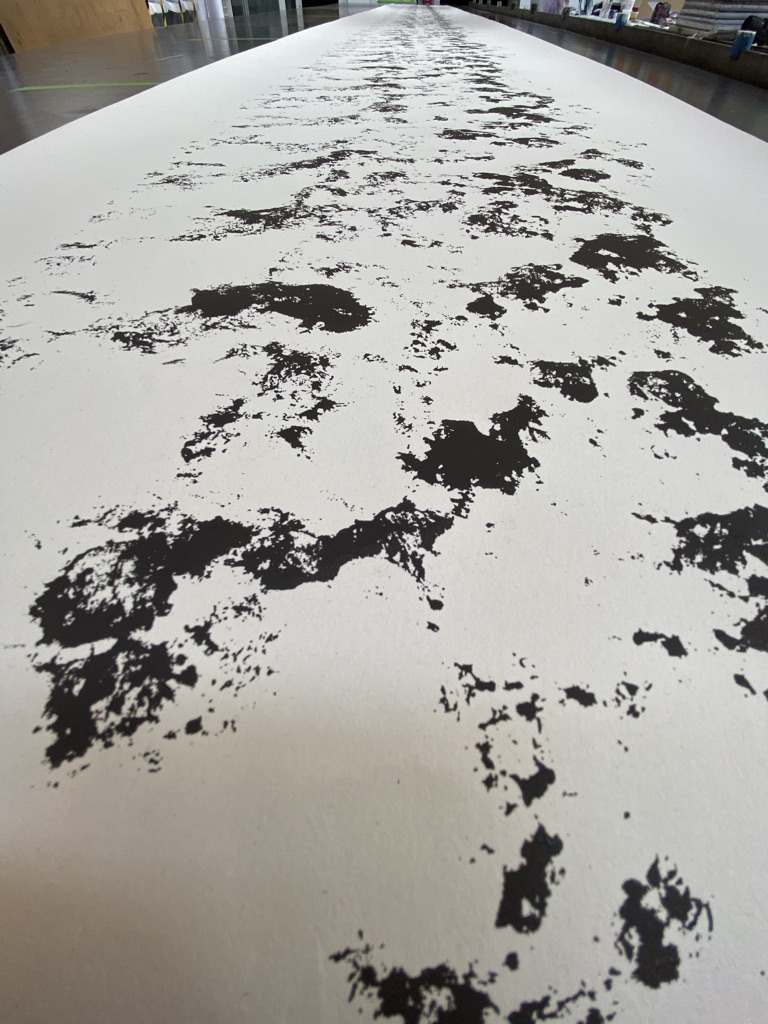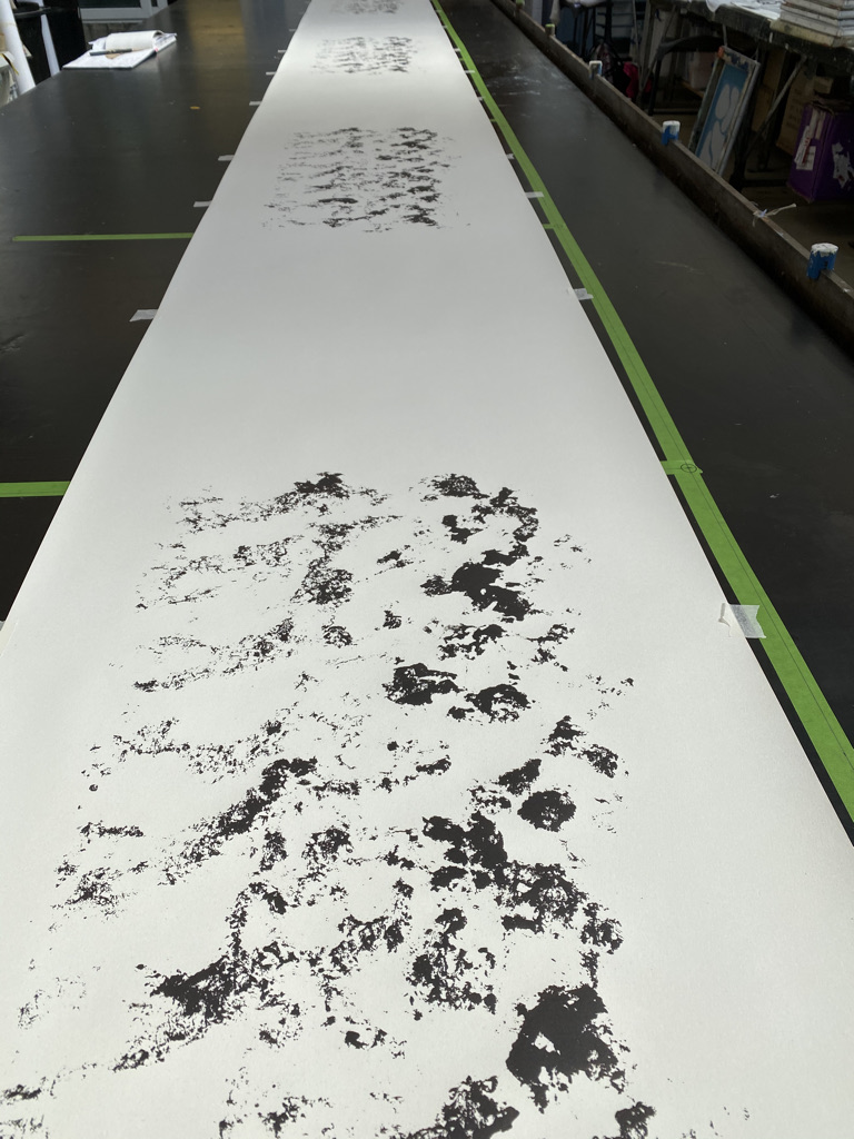 I have been collecting images of vehicle tyre tracks from Byway 745 for some time, building up a series of mono prints made by lying thin paper directly into muddy ruts. Once the mud is dry the image becomes rather faint and indecipherable, so I’ve been puzzling over how to make something stronger, and also longer, that will read, at a glance, as a tyre track. Screen printing is the process I’ve been using, making several technical steps from the original mono print to arrive at the solution.