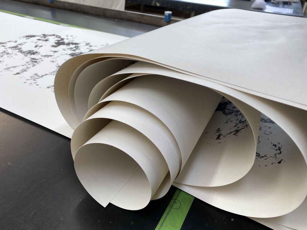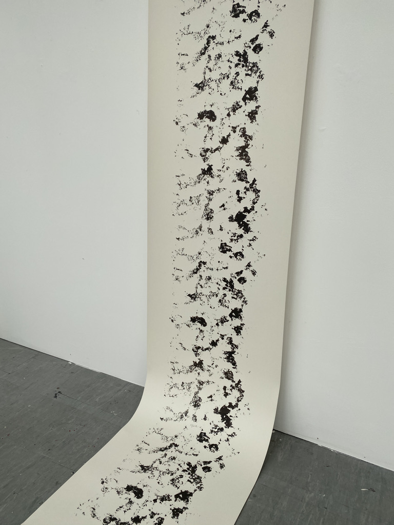 The plan was to make a repeat of the original image so that it could be printed on really long paper. The paper in mind was wallpaper lining paper, a material already used to make long drawings and frottages. This is not a direct print of the tyre track in the way that Robert Rauschenberg’s Automobile Tire Print of 1953 is, in which John Cage drove his car over the paper, but more of a simulation from a direct starting point.
