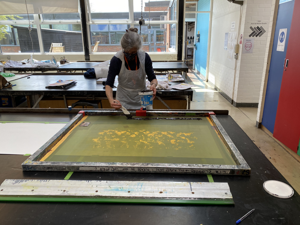 The stops are fixed to the bar that runs down the length of the table and are numbered. The screen has a bracket that rests against one side of each stop every time you print and has two spacer bolts that ensure it is always the same distance from the bar. You print odd numbers first and then even numbers to allow the ink to dry before laying the screen over it. It was only possible to print four times before needing to clean the screen, or risk the ink drying and clogging up the mesh. An A1 size screen is a two person job as the squeegee is an arm’s span. One person holds the screen steady and helps lift it clear of the paper and into the next position.