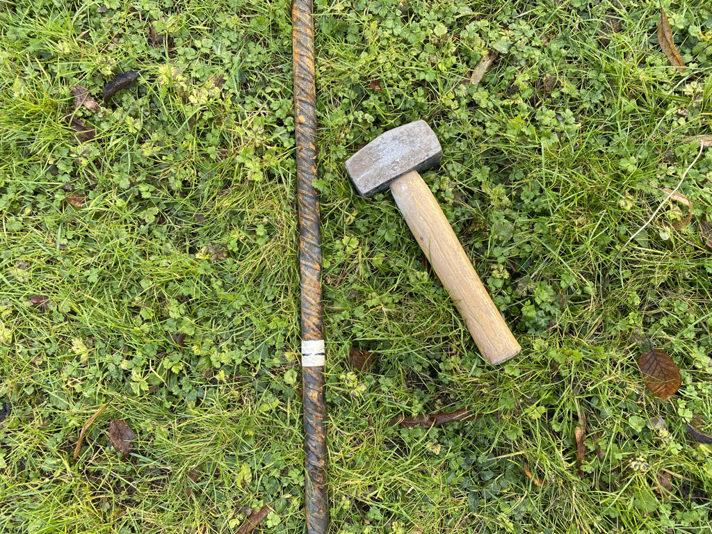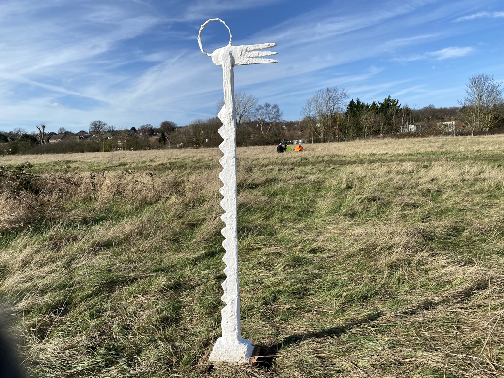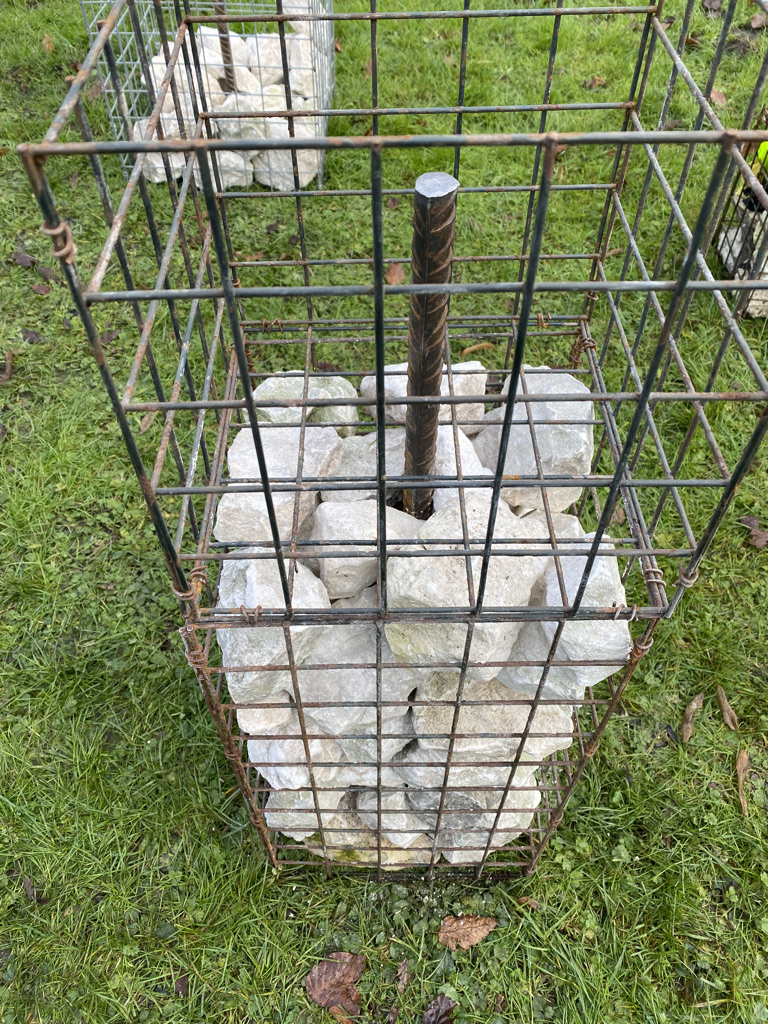 I’d had in mind to somehow present the ‘bouquets’ in a way that would reference the roadside memorials I’d originally been thinking of, so I began to lash them to a traffic management A frame to make a free-standing sculpture. There was no temporary road sign to go with the frame but it occurred to me that to make something of similar dimensions as a support for the photographic images would be a way of presenting the record of the placings on the dead ash trees and to create the link to the phenomenon of grassroots memorialisation of nature. I worked on degrading the images a little before building a collage of them on both sides of a ply sheet that can be attached to the frame with the same fixings as a temporary road sign.