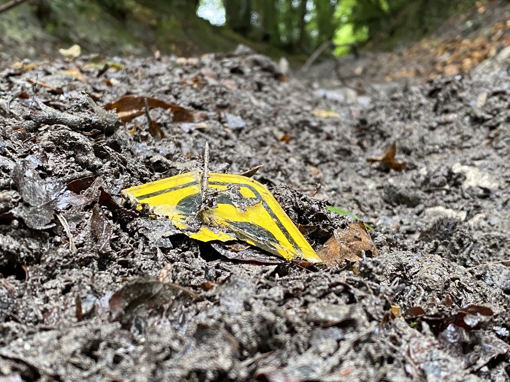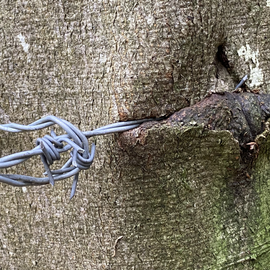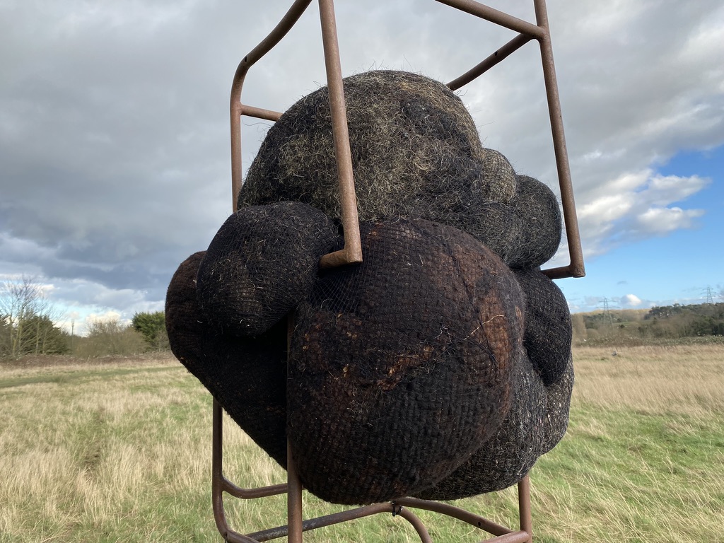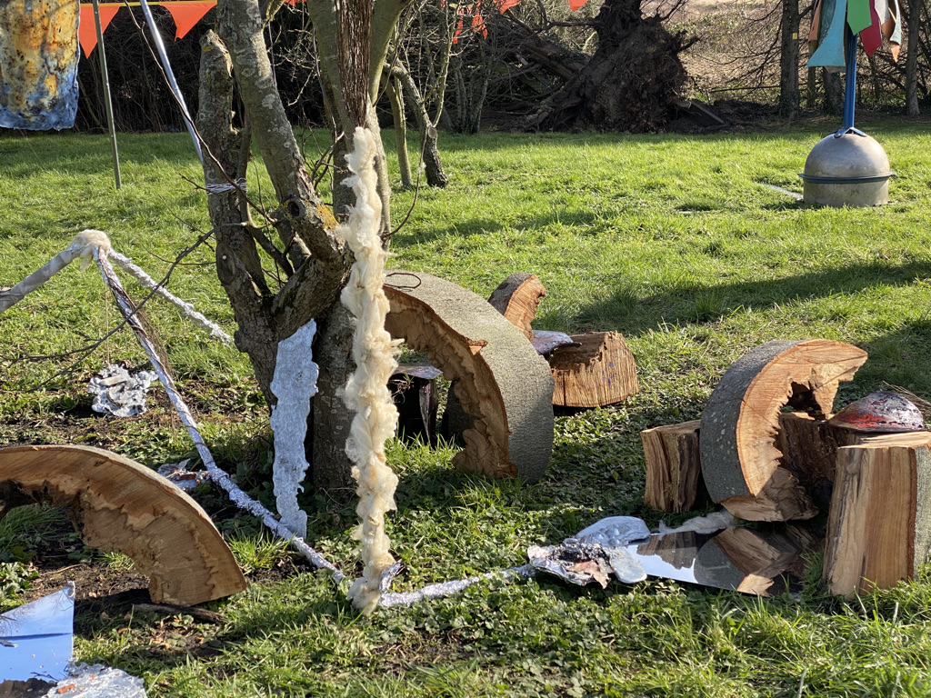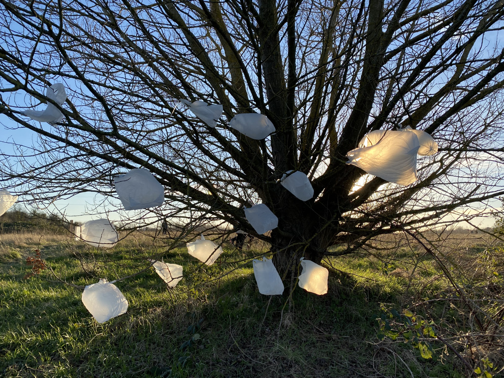 Once I’d sorted and selected the best images, then the question of how to use them needed addressing. Was this the work – the intervention of placing the objects back into the landscape and photographing them? Is the connection between fossil fuels and plastic waste then linking both visually and intellectually to biodiversity loss, the storms that fell the diseased ash trees, the global trade in trees that would have hastened the spread of the fungus that causes the disease, the fashioning of the plastic into objects that resemble bouquets used in honouring human loss now honouring loss in nature? The fact that trees are also traditionally used to honour memory of a human life added to the mix.