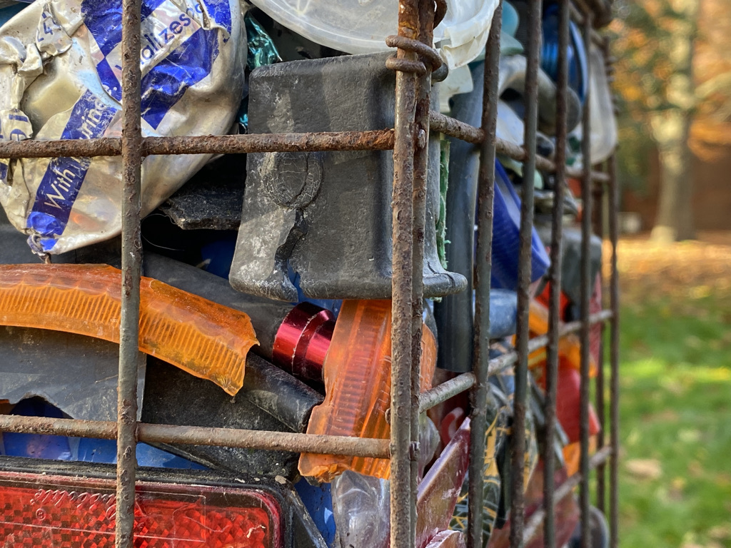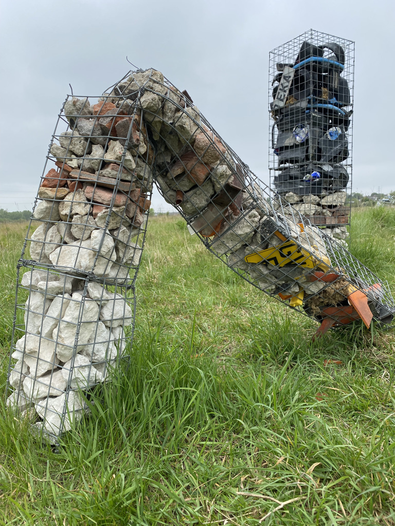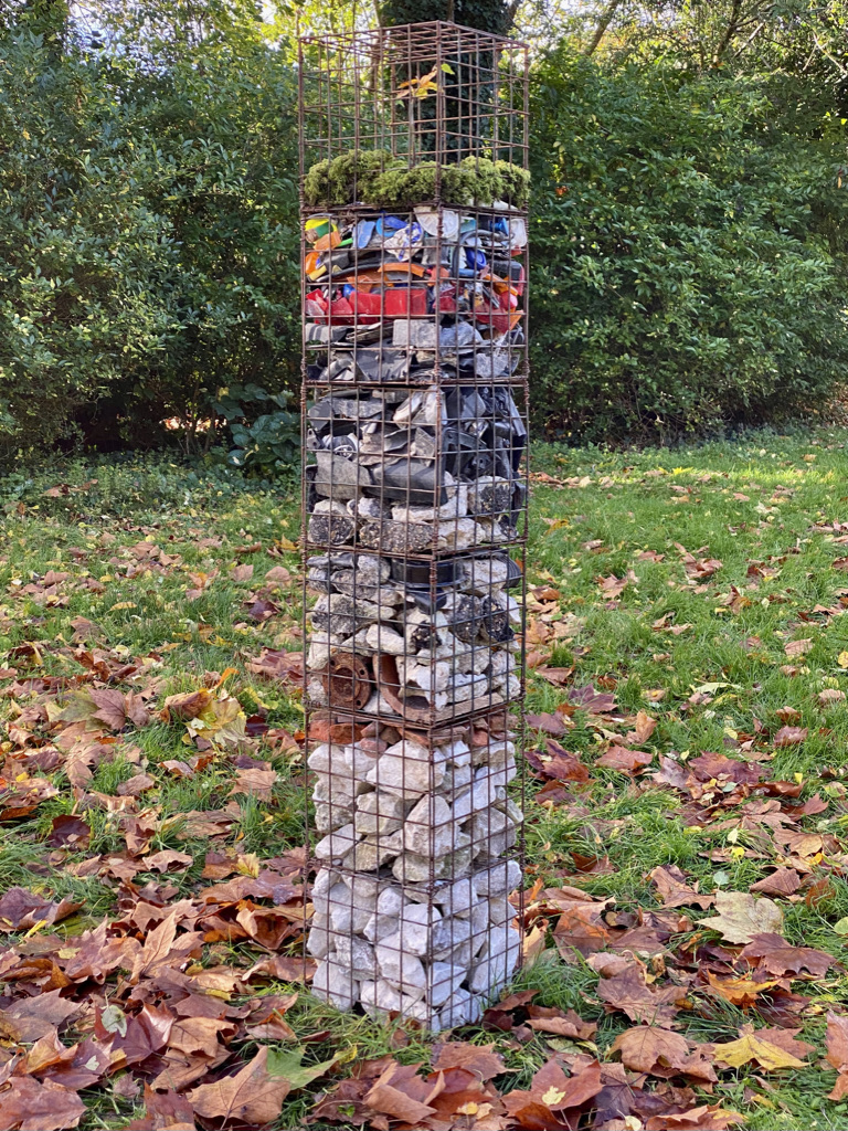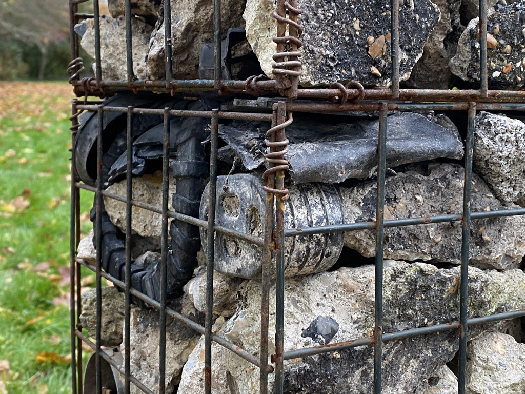 Where I walk is very rural and essentially unspoilt but even here plastic waste accumulates. It is not cleaned away as it is in a town, although it is certainly not abundant in the way it is along our A roads. Each time I walk I return with something, from crisp packet to cable tie. The waste comes from recreation, agri-business, general road users cutting through the lanes and fly-tipping. Weird juxtapositions are thrown up between domestic objects, packaging and broken infrastructure. Still thinking of roadside memorials I have continued to build these assemblages, initially mounting them in a cluster on the wall.