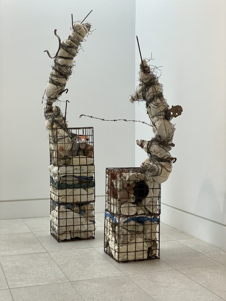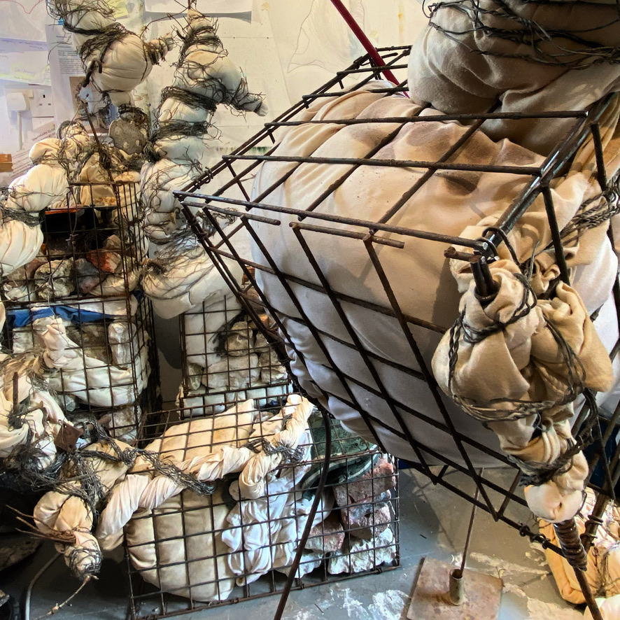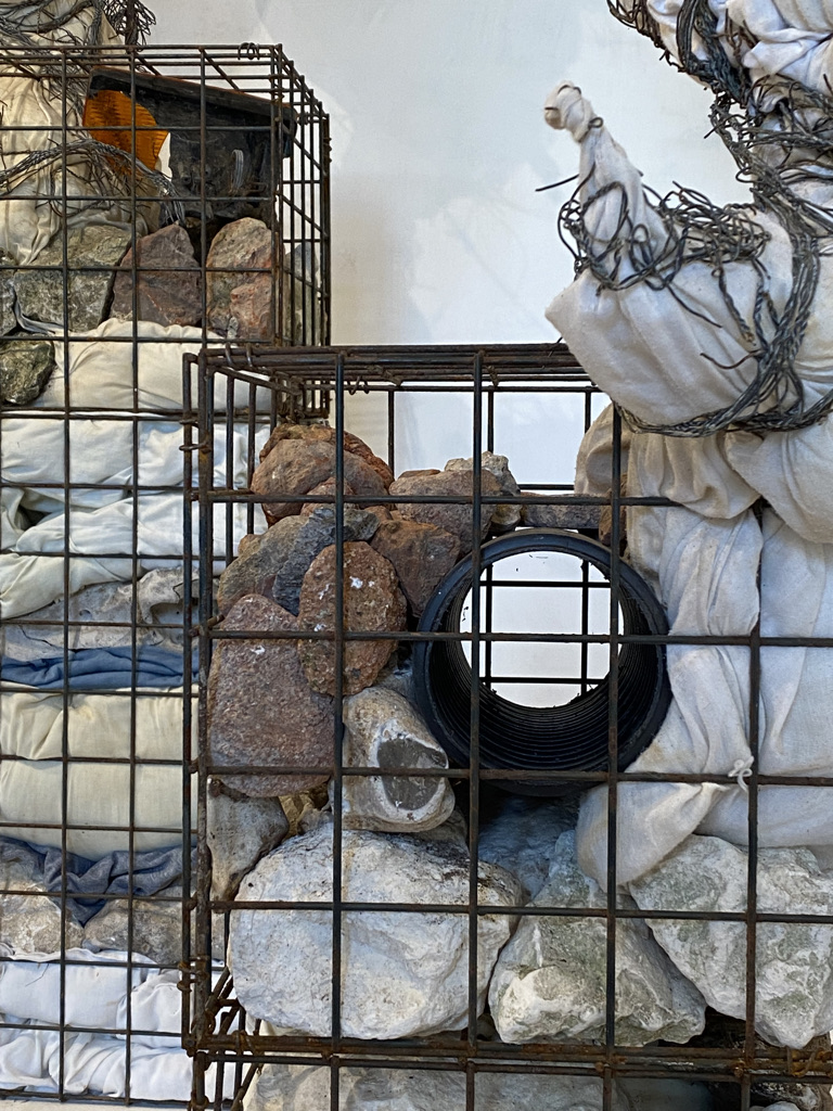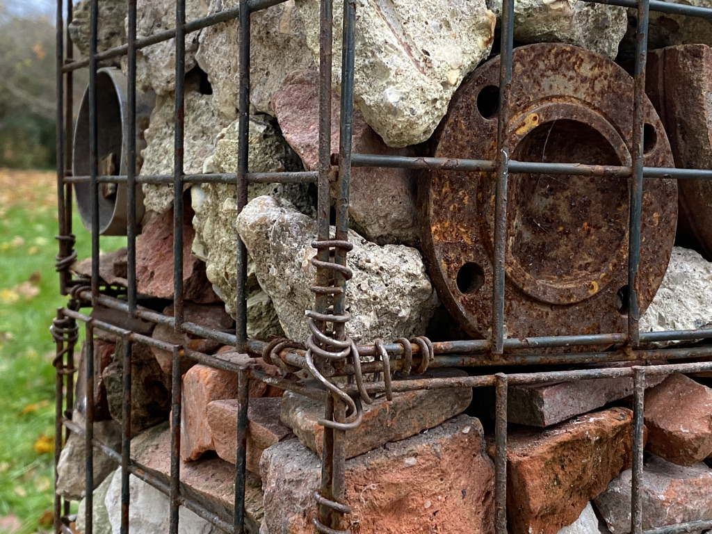 Where I walk is very rural and essentially unspoilt but even here plastic waste accumulates. It is not cleaned away as it is in a town, although it is certainly not abundant in the way it is along our A roads. Each time I walk I return with something, from crisp packet to cable tie. The waste comes from recreation, agri-business, general road users cutting through the lanes and fly-tipping. Weird juxtapositions are thrown up between domestic objects, packaging and broken infrastructure. Still thinking of roadside memorials I have continued to build these assemblages, initially mounting them in a cluster on the wall.