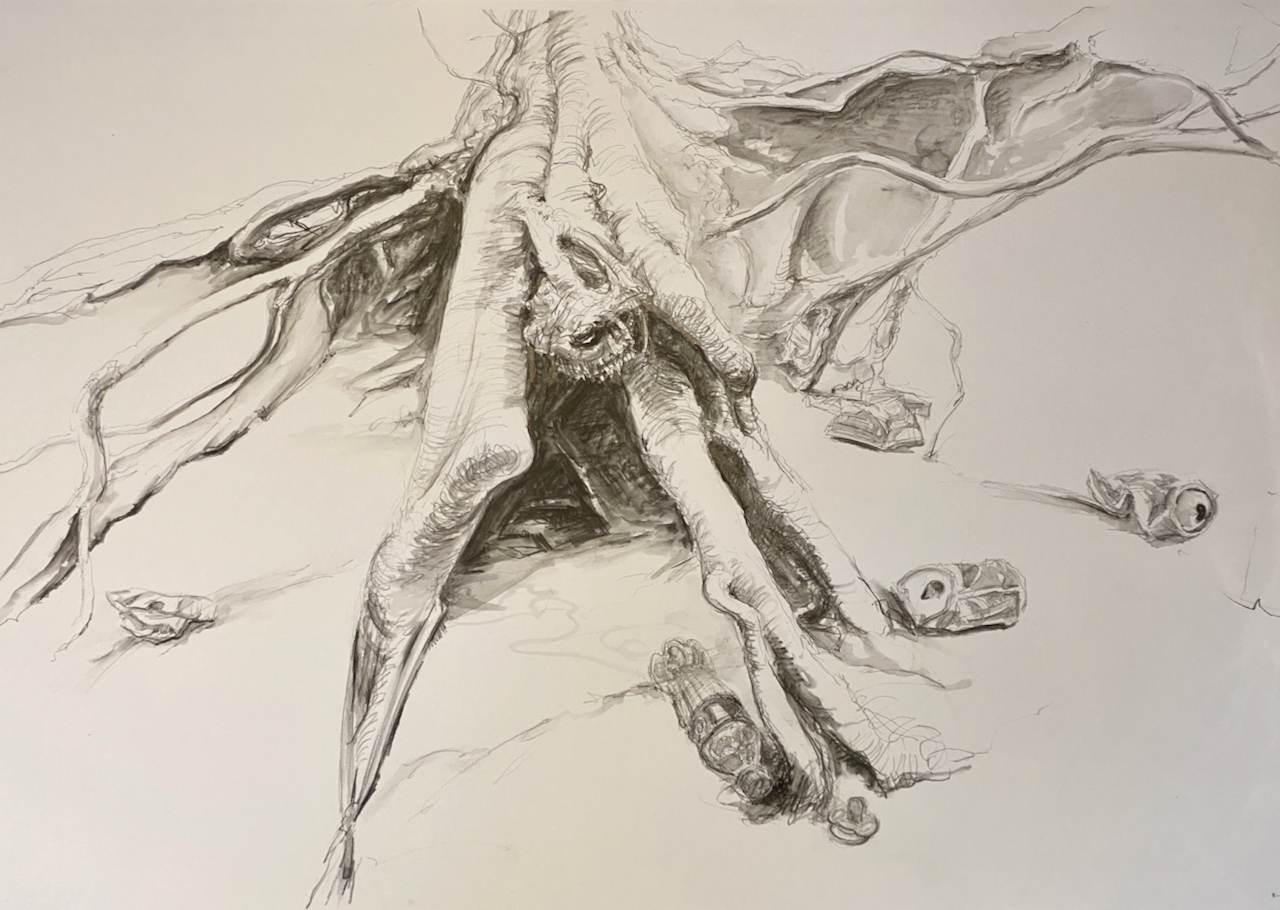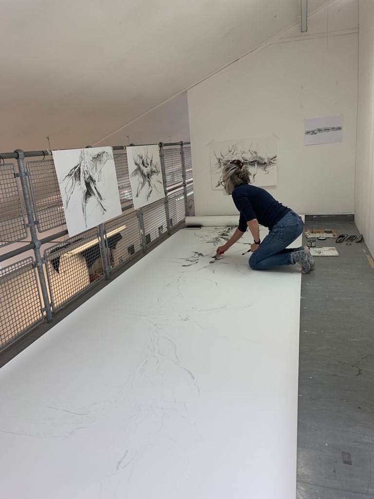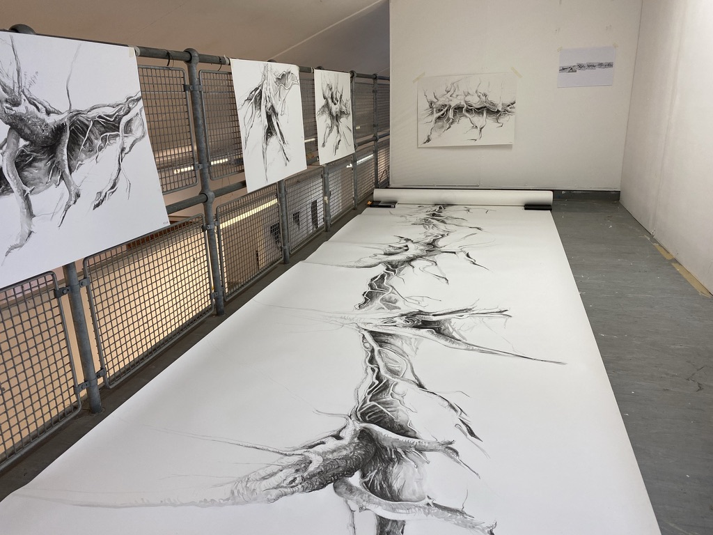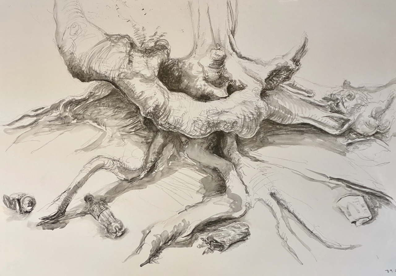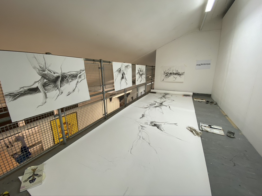 The litter marks evidence of human intervention in this landscape, along with that held in the shapes of the trees, once a coppiced hedge, and the bank beneath it which has been eroded by human traffic. I’m now ready to start the task of weaving a horizontal layer of new drawings across the entire length of the 7 metre drawing at the point where the roots emerge from the bank. I’ve made a rough plan on a photocopy and will have to work in sections on the floor. It is now time to get going with it.