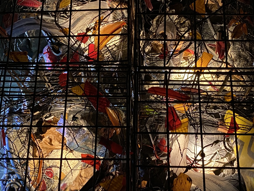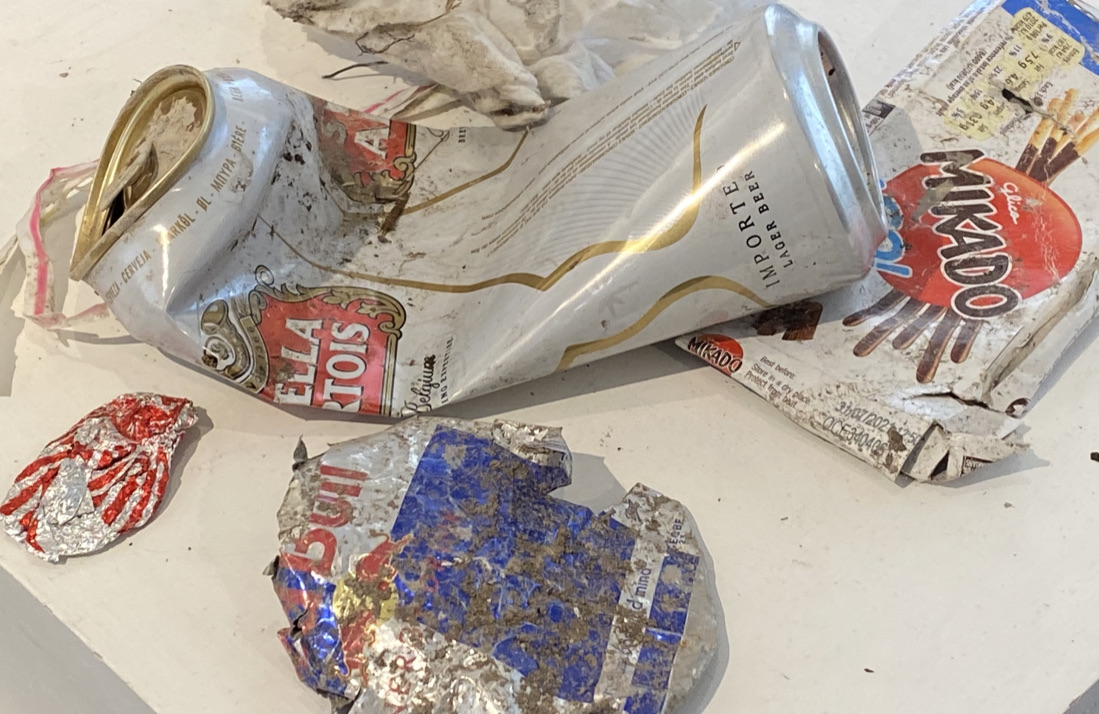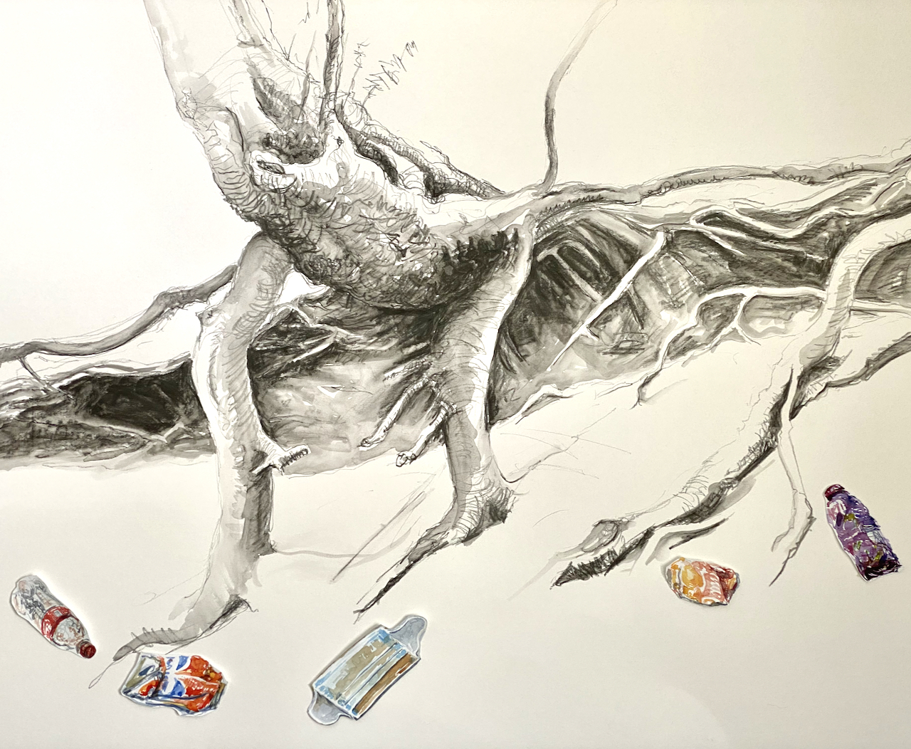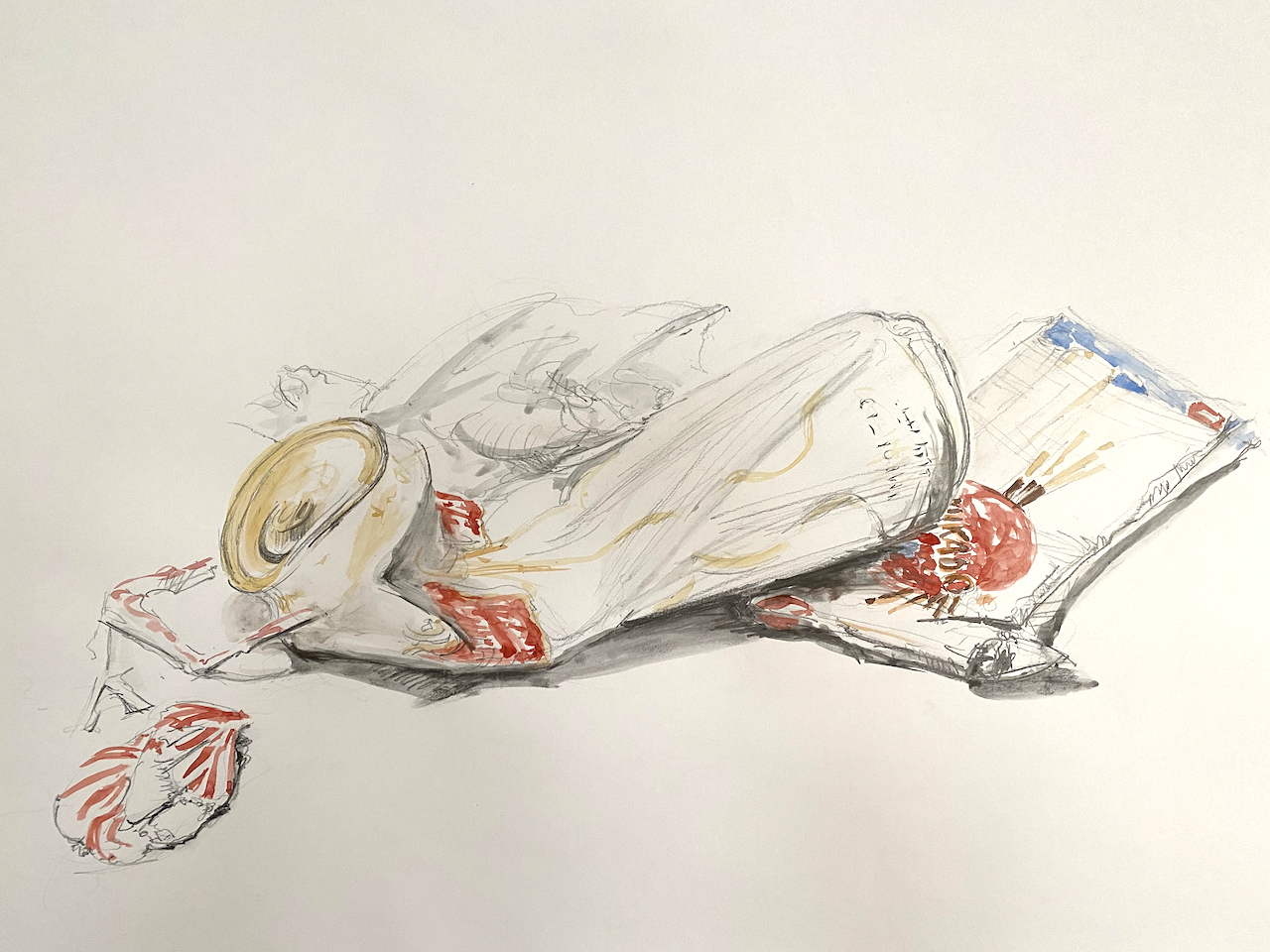 I have been drawing from observation in the studio using graphite and watercolour wash. Drawing directly onto the A1 originals to work out scale and positioning, to be transposed later onto the 7m drawing. The question of colour or no colour is the most vexing. The objects are often instantly recognisable from their colour, the ubiquitous reds of Coca-Cola or Stella Artois and the purple of Ribena, even if they have been crushed and partially destroyed. To help me decide, I have created temporary collages on the original graphite drawings with watercolours of the litter as well as with photographs of it.