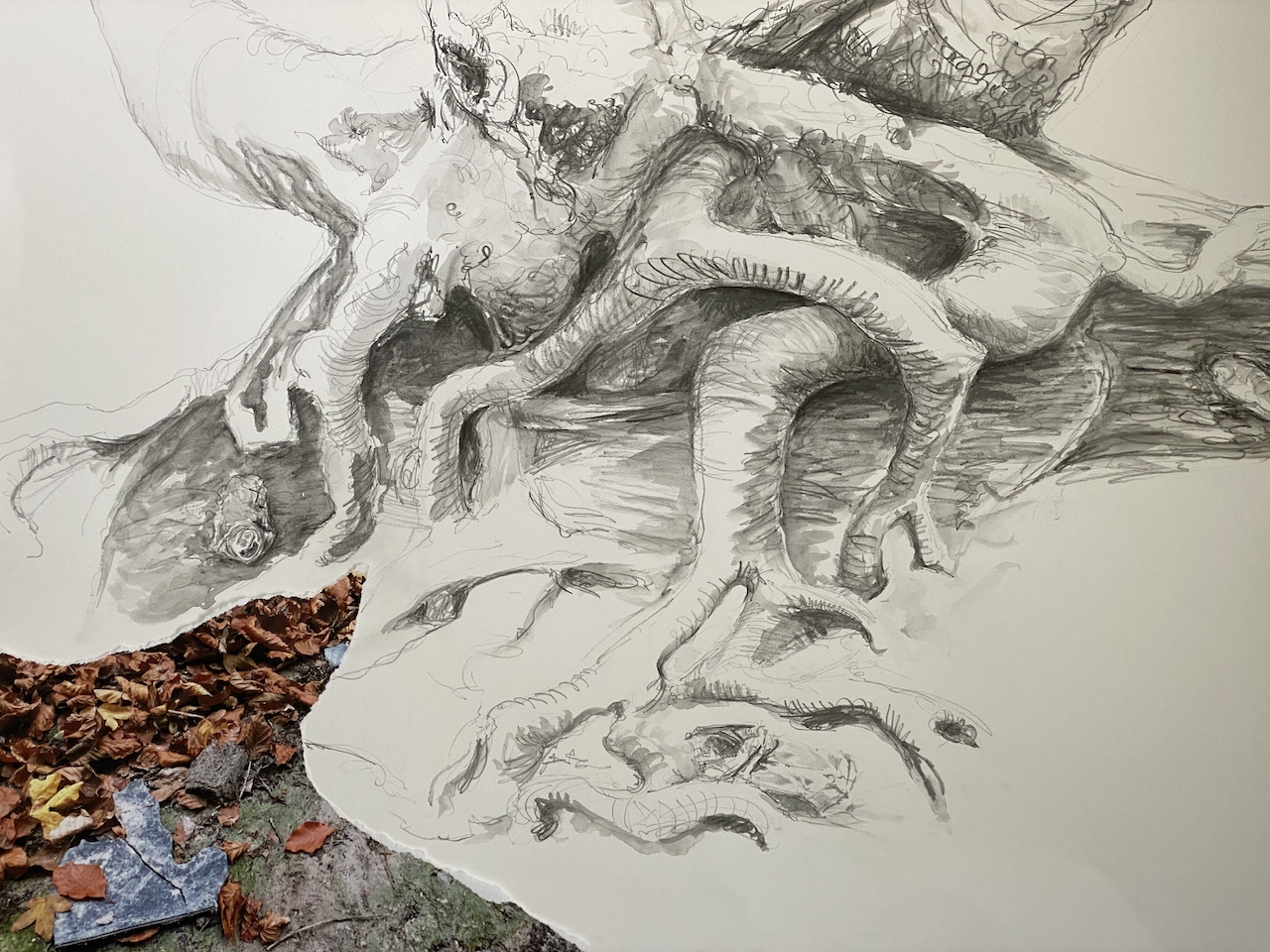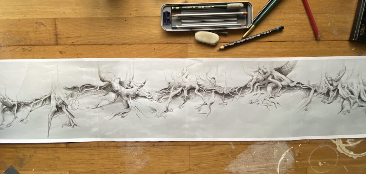 I have a large scale work in progress – a 7 metre long drawing using the line of beech trees that borders Byway 745. I’m in the planning stages of further work on this drawing, considering the various options for weaving imagery of the litter I’ve been collecting from the track beneath the line of trees.