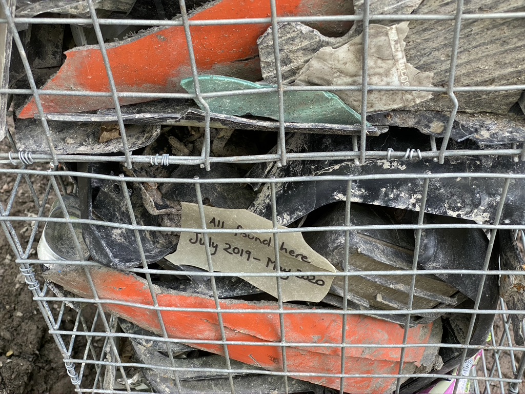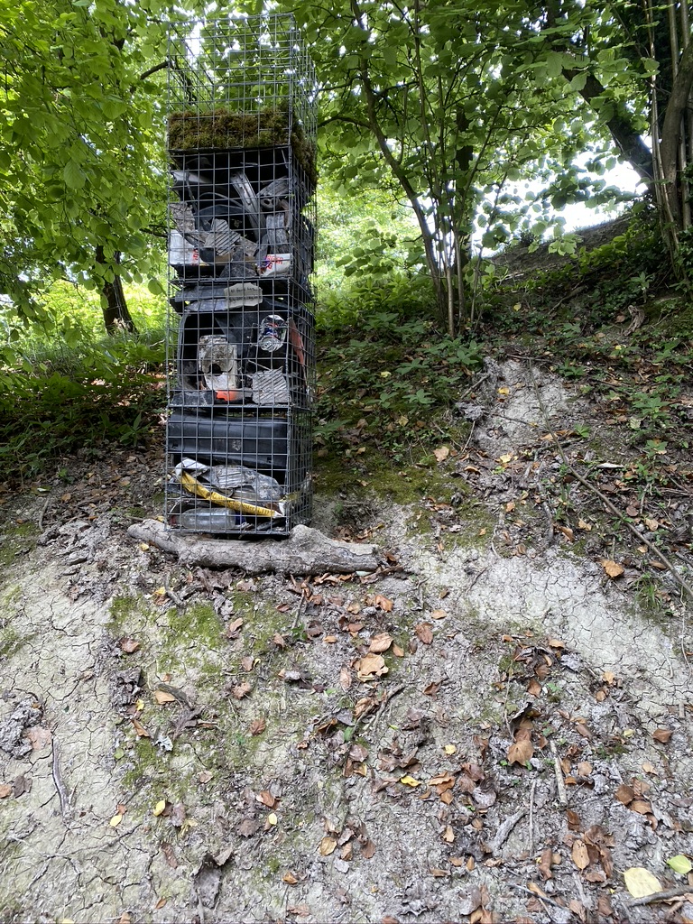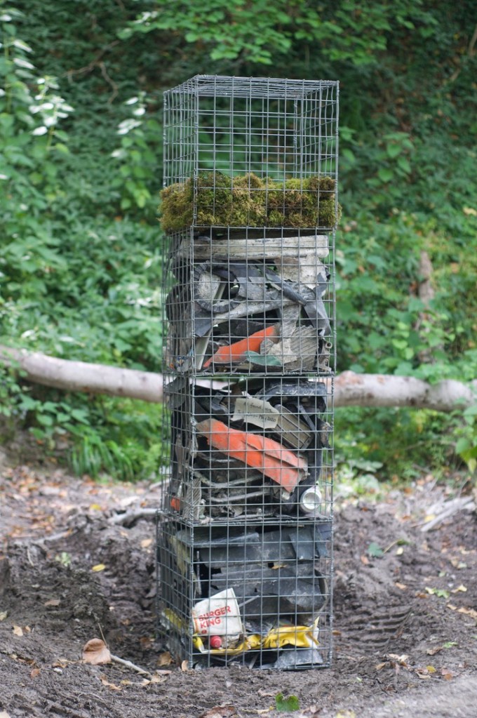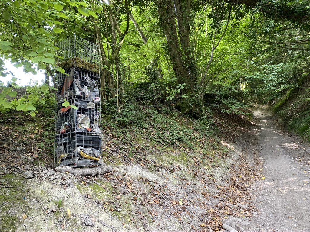Since my excursion in May to collect up rubbish collected over 10 months on this ancient Byway, I have resolved a piece of work that encases the collection within a gabion basket structure. The work consists of four 40cm cubes, three of which are full of the manmade detritus and one that has a 12cm layer of moss in the bottom, out of which some of the black plastic protrudes. The proportion of living material, in this case moss, to rubbish is a deliberate reference to field geologist and stratigrapher Jan Zalasiewicz’s metaphor of the Anthropocene Square Metre in which the mass of human-made matter is 10 times that of the mass of living matter.