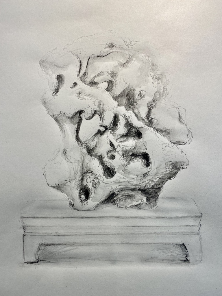 I started my investigation with two drawings from the scholars’ rocks I had chosen to home in on. Trying to think 3 dimensionally whilst drawing from a photograph was a challenge. I began to think of sculptors’ drawings I admire – Henry Moore and Tony Cragg – with their use of contours to describe volume. The way their sketchbook pages fill with multiple iterations of forms.