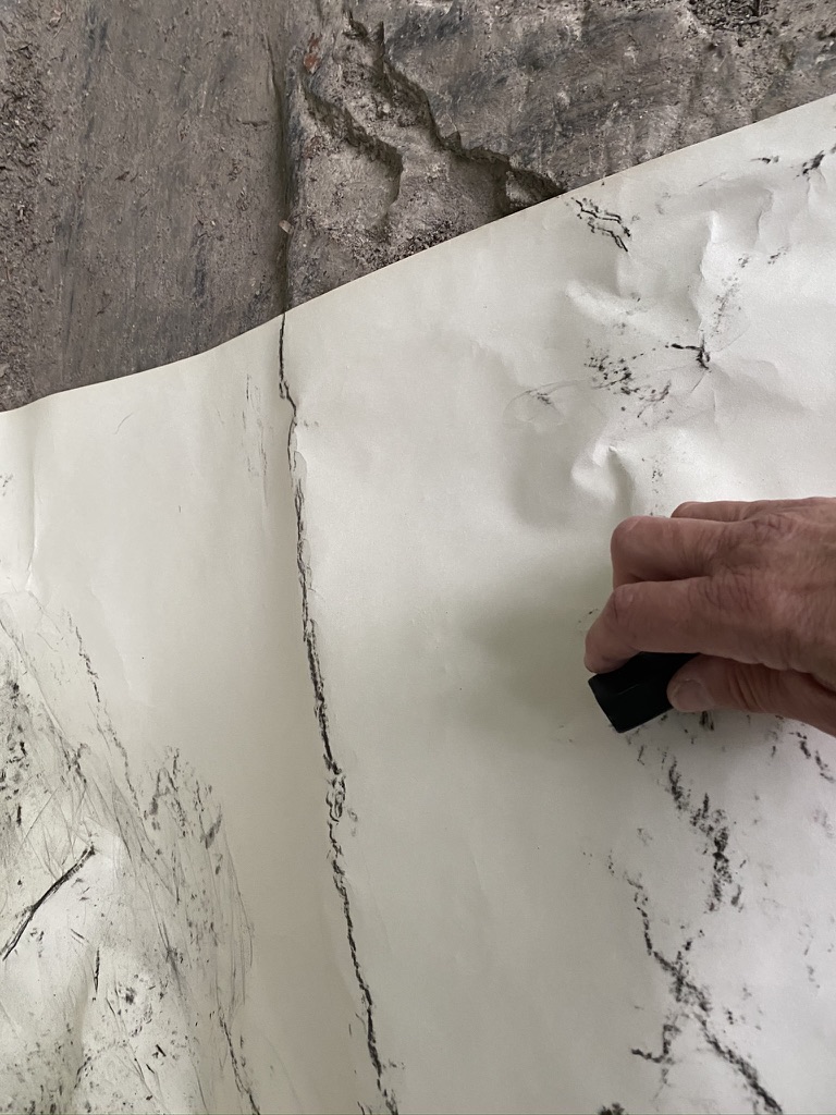Work in progress. Rock frottage, tyre track mud monoprint and photographs on tracing paper.