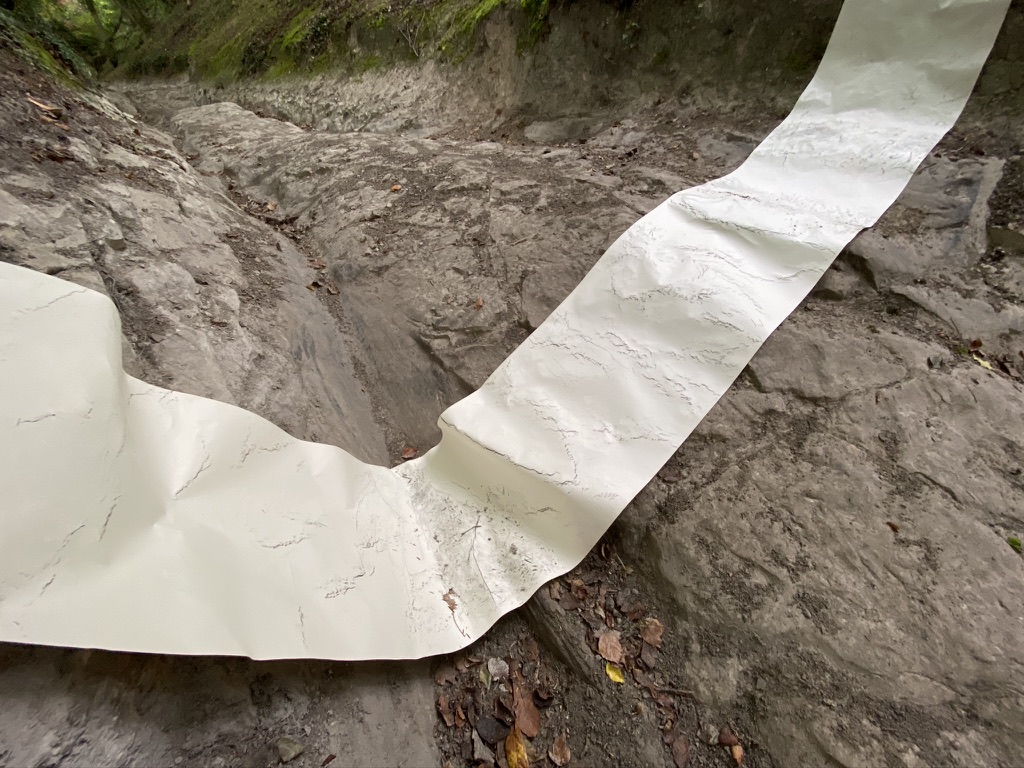 It would be interesting to be able to site the work in this landscape for longer, to engage with the users of the space. In this instance the only passer-by was a cyclist, in a hurry with gravity behind her, who kindly dismounted as she skirted around the work as I attempted to make the photograph below. The photographic evidence of the intervention is very much part of the work and will form part of any gallery presentation of the piece.