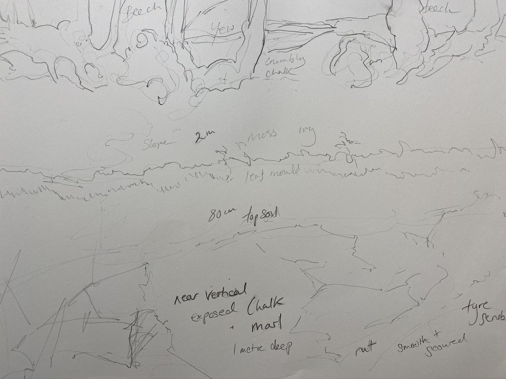 I have recently started making daily drawings on a 10 metre section of Byway 745, deciding to home in on, rather than pass through, the space. To establish a kind of “observatory” examining the whole space from the trees at the top of the banks down into the chalk trench of the track and up again. A cross section of the geological, biological and human history of this critical zone – of air, soil and rock. Data from maps and GPS apps have been recorded to pinpoint the space and more research into it’s history will follow but the real starting point is on site drawing.