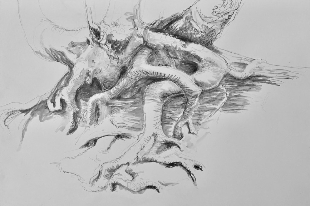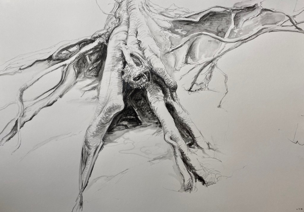 Liz Clifford. Beech Roots 2020. Pencil and wash.
