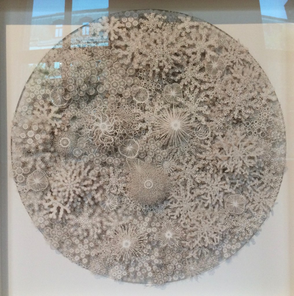 Los Angeles artist, Mark Bradford, at Hauser & Wirth in the West End until 21st December offered a really visceral contrast to Panayiotou’s cool approach. Bradford’s paintings are vast, layered, distressed, vibrant and energetic surfaces. He uses an array of found materials, collaged, cut into and then stripped away to create grids and map-like images alluding to repressive urban infrastructure with a stunning sense of colour. Layering and stripping away again making me think of archaeology.